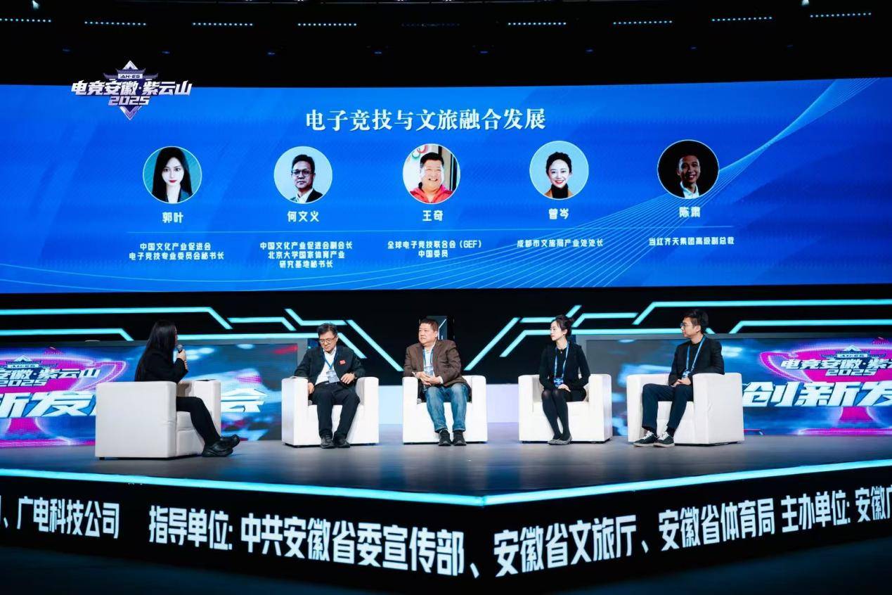 在“电竞+”跨界融合议题中,中国文化产业促进会副会长、北京大学国家体育产业研究基地秘书长何文义从商业模式切入,阐释电竞赛事在缓解旅游淡季、提升游客复游率及目的地影响力中的独特价值;当红齐天集团高级副总裁陈肃结合前沿案例,指出VR/AR与人工智能正推动沉浸式电竞文旅体验从概念落地现实;成都市文旅局产业处处长曾岑以成都实践为样本,展示本土文化IP与电竞赛事深度融合的可行路径;全球电子竞技联合会委员王奇立足安徽本土,围绕徽文化符号转化、叙事创新与年轻化表达等维度展开深入探讨。