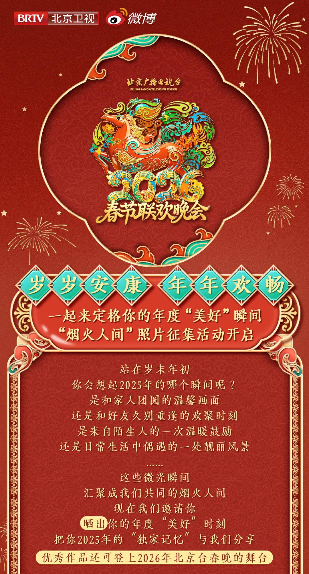 “烟火人间”照片征集活动面向大众征集镜头下的美好时刻,涵盖家人团圆的温馨画面、好友久别重逢的欢聚时刻、生活中偶遇的一处靓丽风景等洋溢暖意的定格。参与者带指定话题分享作品,优秀影像将有机会登上2026年北京台春晚舞台。