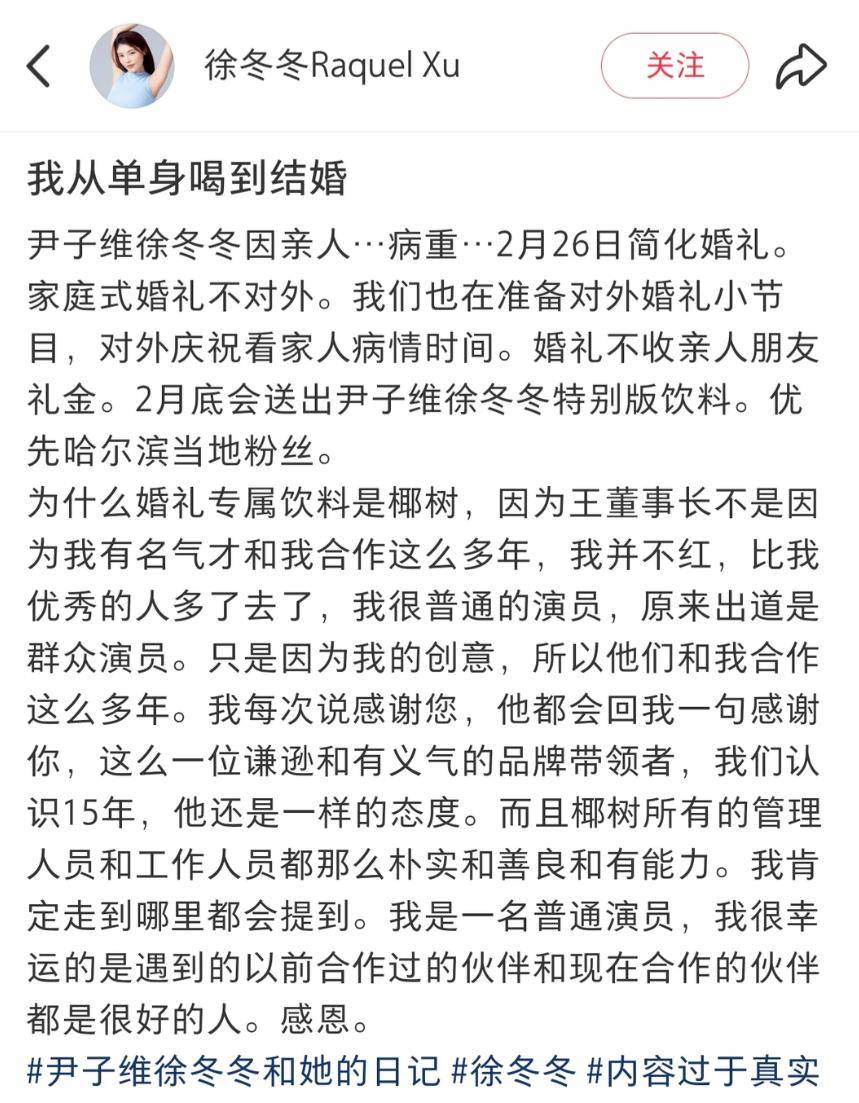 未来,无论是作为演员继续深耕作品,还是作为椰树的“家人”传递温暖,徐冬冬都将带着这份清醒与坚韧,走得更远。就像她在微博里写的:“有偏爱我们的人就此生无憾了。”这份偏爱,来自品牌的信任,来自观众的认可,更来自她对自己人生的笃定掌控。最后衷心祝愿这位从荧幕走到生活的大女主新婚喜乐,岁岁皆安!