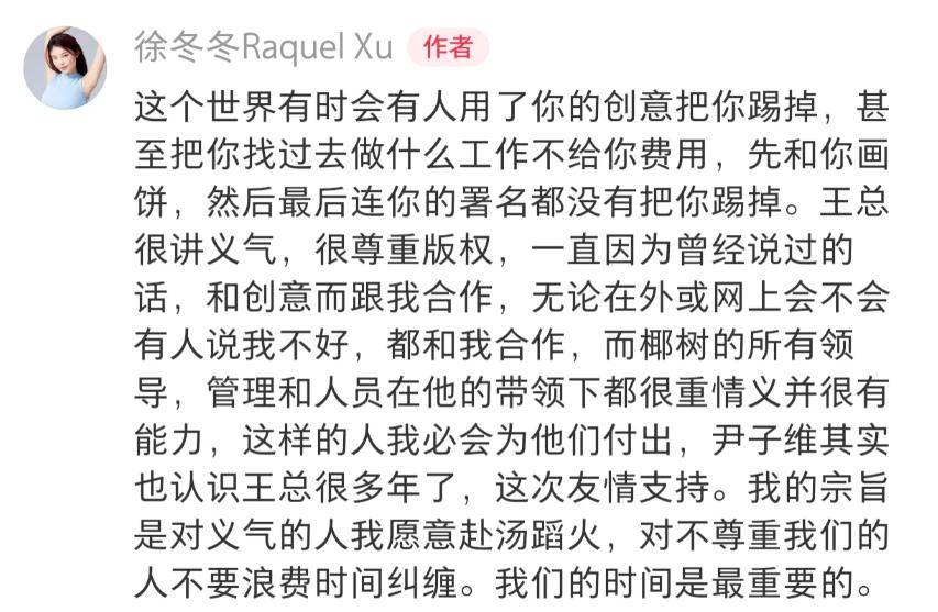 在徐冬冬的微博里,她提到与椰树集团王董事长的合作渊源:“王董事长不是因为我有名气才和我合作这么多年,我并不红,比我优秀的人多了去了,我很普通的演员,原来出道是群众演员。只是因为我的创意,所以他们和我合作这么多年。”这份始于15年前的信任,让她成为椰树品牌最特别的家人。