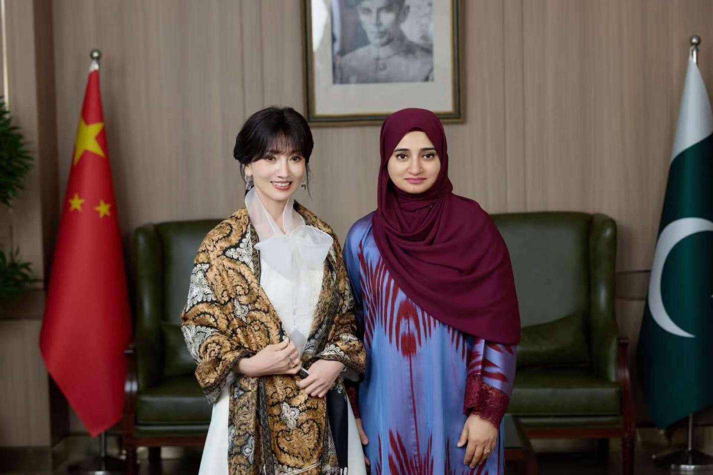 (图为赵雅芝身披卡里尔·哈什米大使回赠的巴基斯坦传统披肩与大使夫人合影)