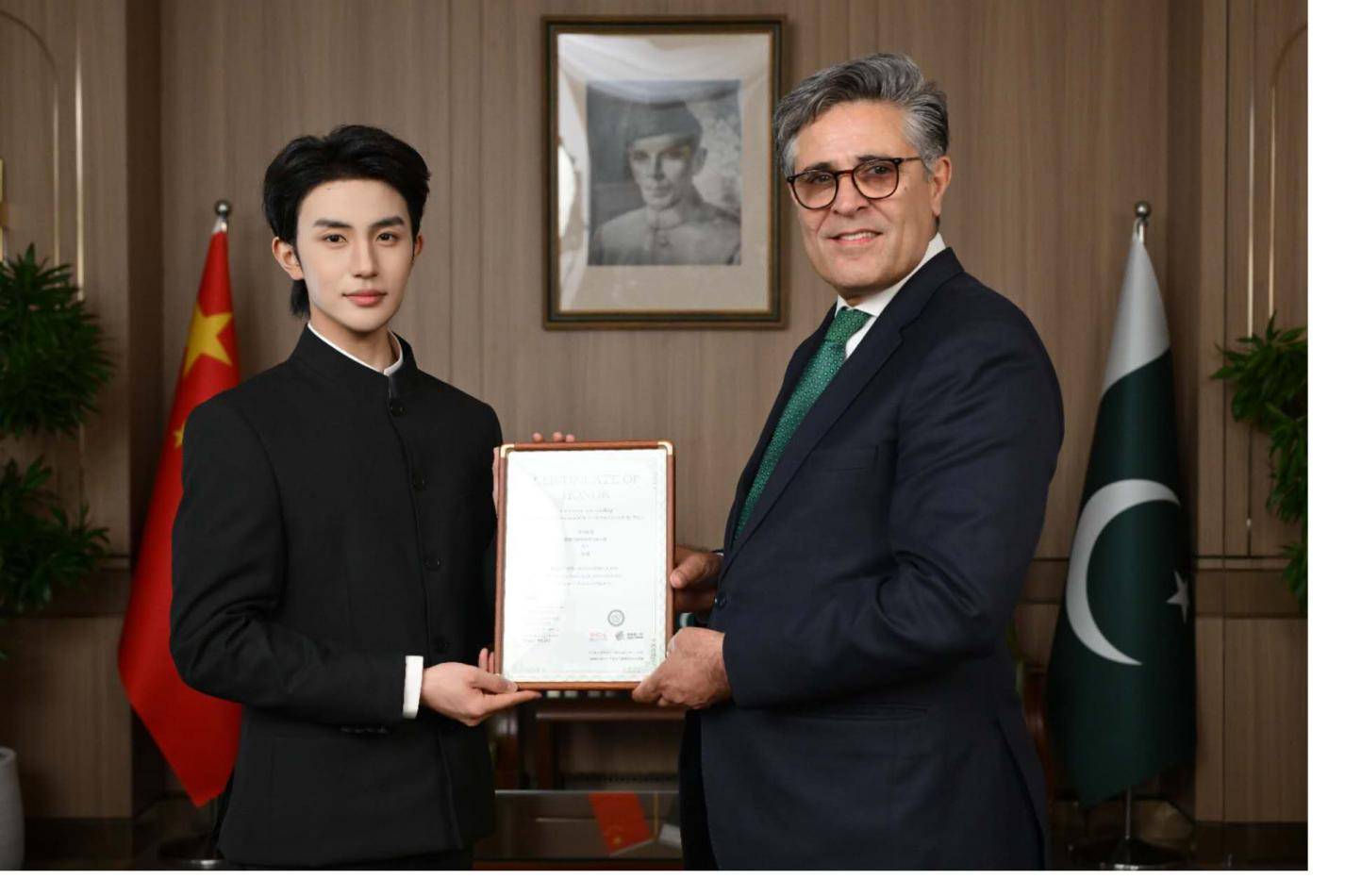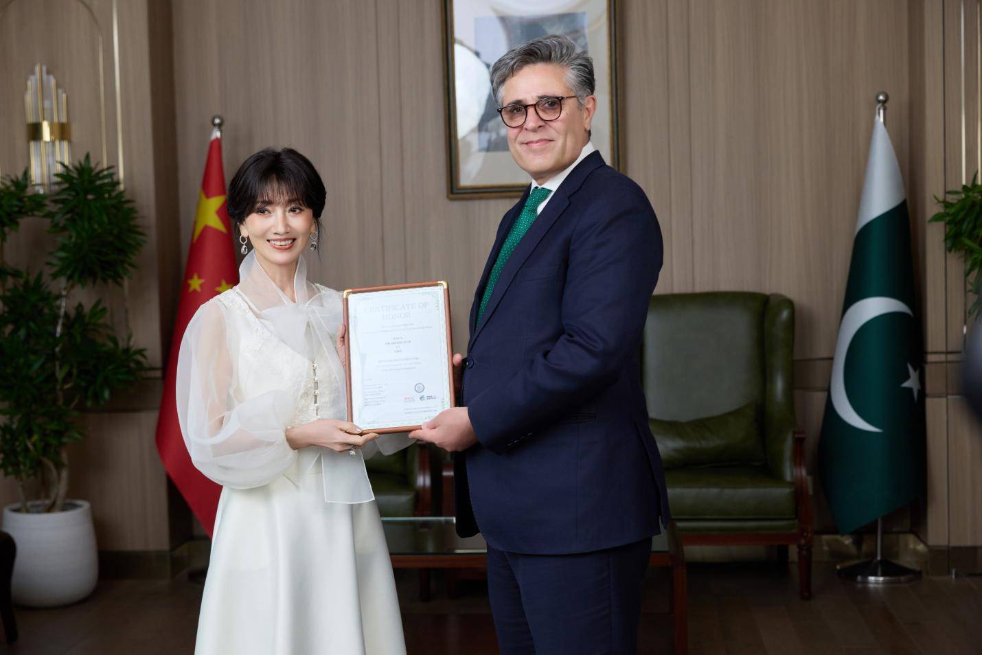 活动现场,哈什米大使为赵雅芝、王子奇、张翅授予“丝绸之路绿地毯行动大使”荣誉证书,表彰三人对丝绸之路绿色合作事业的鼎力支持,并诚挚邀请三位嘉宾赴巴基斯坦访问交流,持续为两国人文文化交流赋能添力。