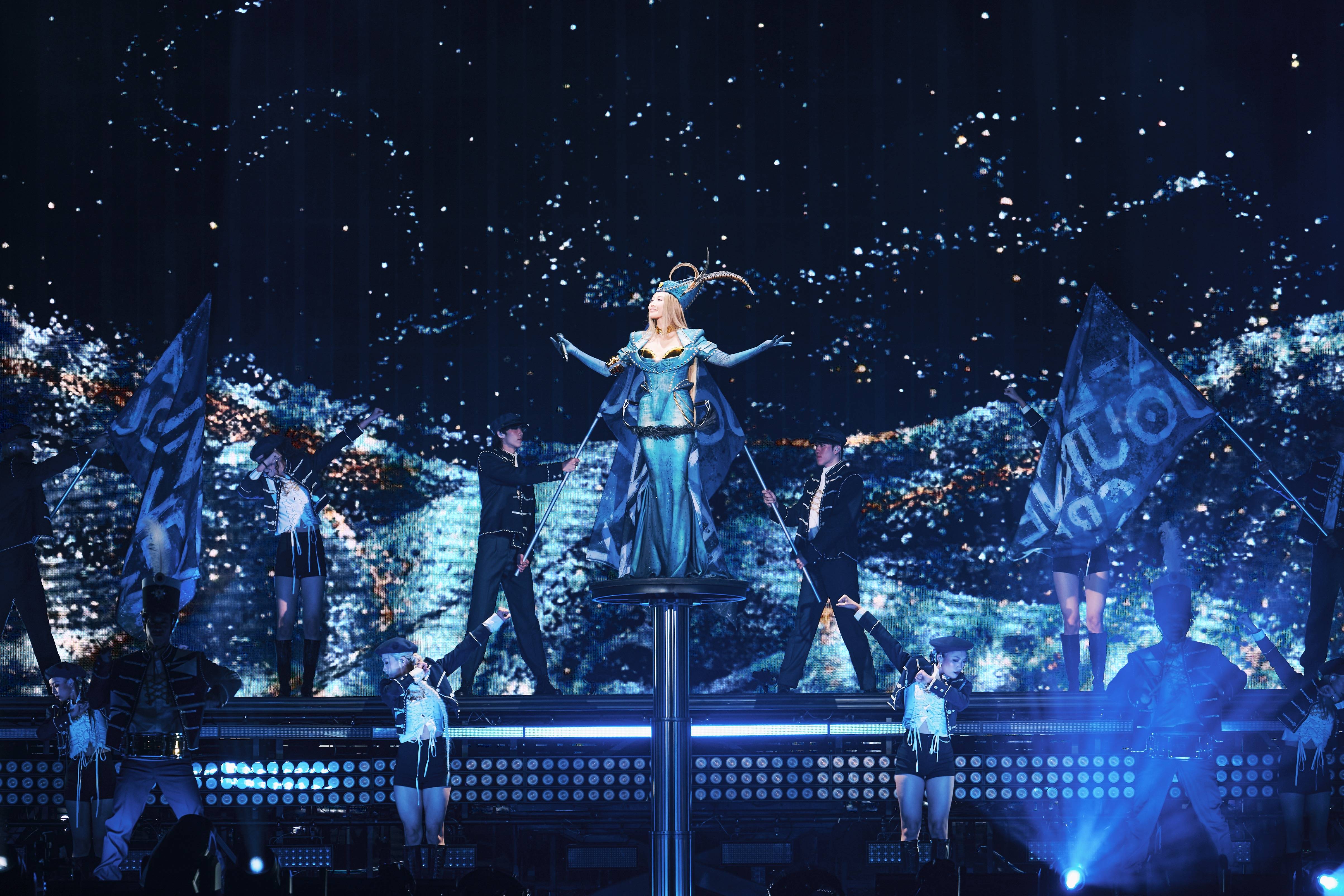 全场演出以经典的曲目《失恋无罪》开场,A-Lin站在高台之上,熟悉的歌声响起,瞬间穿透夜幕,当光影渐亮,大屏徐徐展开,追光聚焦于设计师WINDOWSEN 为A-Lin 特別定制的手工款蓝色华服,充满力量感的线条,勾勒出极具叙事感的设计,使服裝成为声音的延伸,与3D大屏上跃动的海洋视效相辅相成,极具震撼的开场,极大地满足了观众的好奇与期待,为舞台注入属于A-Lin的生命力,精准呈现出她作为舞台主宰者的气场与张力。